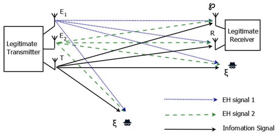 In a dense wireless communication network (WCN), both the energy and security reliability need to be assured. This represents a challenge in the case of a network with a huge number of nodes [1]. Thus, in order to keep up with the energy demands of the increasing number of network nodes, new radio frequency energy harvesting (EH) techniques like simultaneous wireless information and power transmission (SWIPT) are investigated for 5G networks [1,2,3]. Apart from harvesting energy by using SWIPT techniques, many other signal processing applications like channel estimation with SWIPT [4] and physical layer security (PLS) measures with the help of SWIPT technique were investigated in [5]. One of the most important techniques in improving PLS in a wiretap channel is using artificial noise (AN) in the communication channel to degrade the signal-to-noise plus interference ratio (SINR) of eavesdroppers; thereby improving the security of legitimate users [6]. The high energy signal that is used for harvesting energy in SWIPT can also be adopted for creating AN to improve PLS, as in [7]. The secrecy rate of legitimate users in a wiretap channel can be improved with the SINR degradation of eavesdroppers as in [8,9]. Furthermore, the secrecy rate for the multiple-input and multiple-output (MIMO) system model was established in [10]. To avoid the impact of AN on the legitimate receiver, AN is introduced in the null space of the legitimate receiver’s channel matrix. Thereby, AN degrades the SINR of eavesdroppers without compromising the quality of the legitimate users’ signal [11]. However, the successful negation of AN is dependent on the channel state information (CSI) of the receiver at the legitimate transmitter and can be effectively used against very robust eavesdroppers as in [12,13]. This is considered as a challenge in the imperfect CSI condition [14,15]. Another challenge in using AN against eavesdroppers lies in the fact that a jamming attack depends on the channel correlation between the eavesdroppers and legitimate receiver; if the channel correlation is very high, then AN can be partially canceled out by the eavesdropper [16,17].