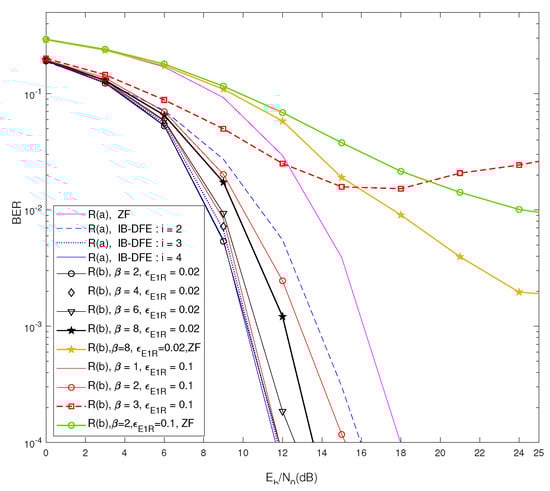 Figure 5 demonstrates the impact of the inclusion of in the IB-DFE receiver, and the results validated the advantage of using (23) over (21) in the iterative loop. had significant SINR gain over with the increase in . At , had dBm SINR gain over , and when , had more than 6 dBm SINR gain over . The results also illustrated the BER difference between the best performance of , i.e., with and versus the performance of with .
