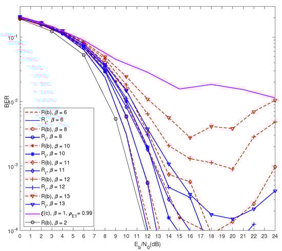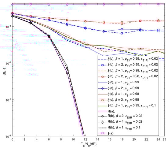 Figure 4 demonstrates the BER performance of in all the scenarios with the comparison to BER of R, and received an incompatible signal for decoding the information. Unlike , with and , and could partially decode the signal, and their performance degraded with the decrease in as the precoding errors increased in turn. Due to high channel correlation between and and similarly between and , the jamming EH signals were partially canceled out in and , allowing them to perform better than . With , performed slightly more poorly as compared to . Even though and could decode information in the high channel correlation condition, the BER results of R demonstrated that, by increasing , the jamming signals could degrade the performance of , while R suffered a negligible loss.