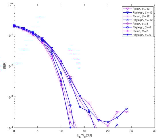 In Figure 6, we compare the BER performance of in Rician fading and Rayleigh frequency flat fading channel conditions. For the simulation of Rician fading, we set for 256 symbols; the multipath gain range was ; the Doppler shift was 50; and the kfactor was 10. The results of Figure 6 demonstrate that the BER performance of under both fading conditions had similar effects on the signal performance. The fading effects were relatively low due to the application of SC-FDMA, and the BER performance improved with the IB-DFE receiver.