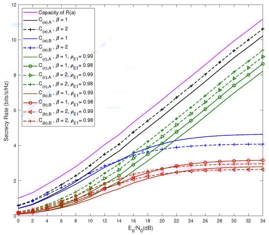 Therefore, even at a very high SINR condition, can be used to degrade the performance of . The secrecy of can be improved at and by increasing under the condition that the value in and is lesser than the value in , , and . Another observation from Equation (15) indicates that, if , then will always be in the negative SINR region.
