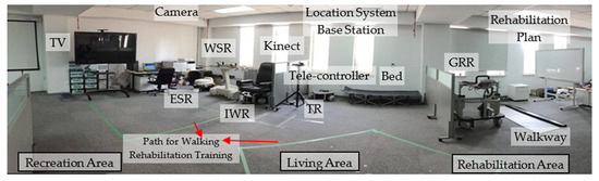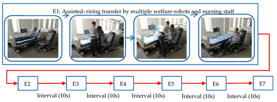 Due to the growth of the aging population and disabled people with an incomplete motion capability, there exist great demands for auxiliary robots and a compliant control strategy under the condition of a relative lack of nursing personnel [1,2,3,4]. The multi-robot system (MRS) has been proposed as an effective and potential approach of ambient assisted living technologies to realize comprehensive nursing. However, because of the deficiency in the functionality, compliant control strategy, and good human-robot interaction (HRI) experience, the MRS has not yet been applied to nursing houses. To solve this issue, our laboratory established a smart house based on six heterogeneous welfare-robots, (including GRR: Gait Rehabilitation Robot, IWR: Intelligent Wheelchair Robot, WSR: Walking Support Robots, ESR: Excretion Assistant Robot, TR: Transportation Robot, and SB: Smart Bed), which integrates compliant assistant technologies, as shown in Figure 1 [5]. The transfer is a transition process of users from one state to another; for example, a rising transfer is a process from lying in bed to sitting in the chair. Some continuous behaviors include many transfer sub-tasks in a sequence, such as getting up to drink water, and then going to the toilet (from rising transfer to standing transfer, and then to excretion transfer). It is a frequent, repeated, continuous, and physically exhausting behavior. It has a huge impact on the physical strength and psychology of users. Physically and psychologically, it also causes secondary injuries such as fatigue, falls, and mental stress. To improve the transfer safety of the user, we propose that all the transfer behaviors be implemented by two robots [5]. Although the smart house could provide a better quality of life to different user groups, HRI in the transfer process has never been studied. The investigation of mental states in independent transfer and assisted transfer is a crucial and effective approach to quantify the workload and fatigue for the user, which has never been considered. It also contributes to guiding the control strategy of MRS to improve HRI security and experience, which has a high research value.