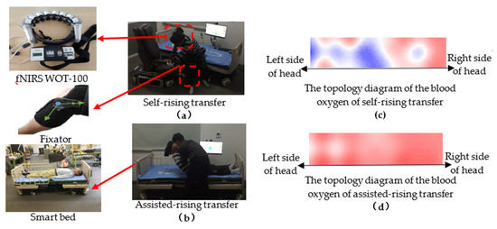 where is the unit-less absorbance variation of a light emitter of wavelength , is the extinction coefficient t of HbX (HbO and HbR) in , is the unit-less differential path length factor, and is the distance (in millimeters) between the emitter and detector. To acquire brain signals resulting from mental arithmetic tasks, 16 detectors are positioned over the prefrontal cortex, in which each channel corresponds to a specific area of the prefrontal lobe. Multiple notch filters are applied to reduce physiological noises [31,32]. In the measurement process, the signal acquisition equipment is worn on the head, and the signal is transmitted to the PC through Wi-Fi. In the preliminary experiment, it is found that there is a significant difference in the topology diagram of the blood oxygen between self-rising transfer (Figure 2c) and assisted-rising transfer (Figure 2d). The blood oxygen content of the subject in the assisted-rising transfer (red area in Figure 2d) is larger than that in the self-rising transfer (red area in Figure 2c).