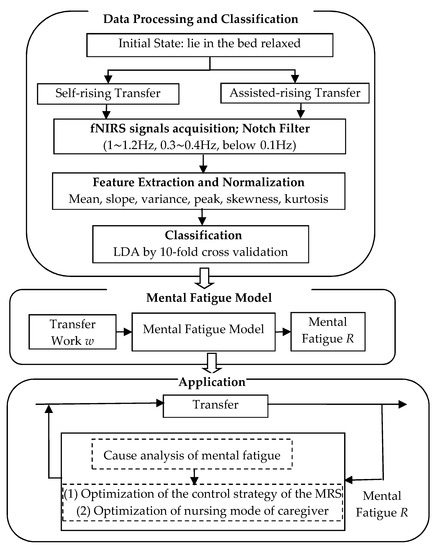 In this study, we propose a novel approach for the quantitative estimation of differentiated mental fatigue. First, to maximize the distinction of mental states when employing two tasks with different difficulty levels, we determine the feature combination and linear discriminant analysis (LDA) classifier for the classification of fNIRS signals with the best accuracy. In addition, the classification accuracy, regarded as a standard, is applied to establish the mental fatigue model. It effectively describes the difference between the mental state of self-rising and assisted rising after the continuous transfer. Finally, mental fatigue is used as feedback to optimize the transfer method from the aspect of caregivers and the control strategy of the robot. This study provides a theoretical foundation for enhancing the user experience and optimizing the control strategy of MRS. We highlight the main contributions of this paper below: