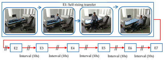 The self-rising transfer and assisted-rising transfer were individually performed seven times in one group experiment, as shown in Figure 4 and Figure 5, respectively. There are seven groups of experiments for each subject. The transfer position of each experiment is the same. In the rising transfer experiment, first, 1 min was defined as a rest period to set up the baseline condition; this was followed by a 30 s self-rising transfer task period, and then followed in turn by a 10 s interval period for the next trial. The time interval was used to return to the original lying state. The experiment of assisted-rising transfer was implemented in the same sequence and time interval. To reduce the influence of fatigue accumulation on the results, enough rest time was reserved between the two experiments. This kind of continuous behavior transfer without rest will seriously affect the physical workload, fatigue, and mental fatigue of different user groups. It can be used as a reference for continuous action that integrates multi sub-tasks, such as rising-standing-walk rehabilitation training-drinking-sitting, etc. Some behaviors would consume more physical strength than simple behavior due to the complexity and particularity of their conditions, especially for people with mobility difficulties. Therefore, in this paper, we investigated experiments between the two tasks with different difficulty levels.