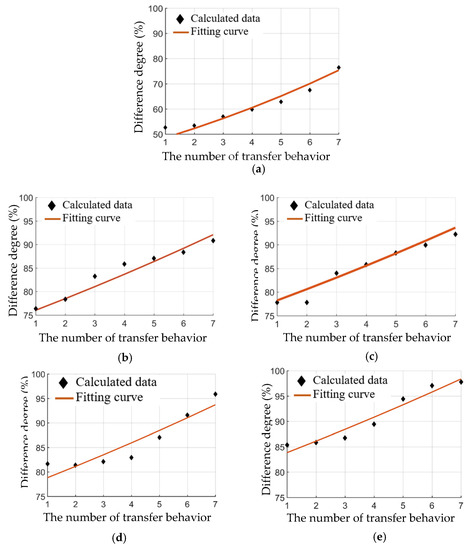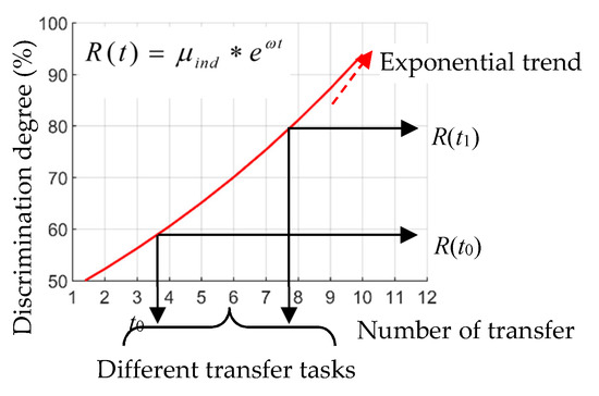 where . By integrating , the discrimination degree R(t1), after the number of the transfer behavior () from its initial condition R(t0), can be estimated by Equation (13):