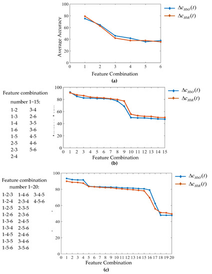 The comparison among classification accuracies. (a) All 1-feature averaged across all subjects using and signals; (b) all 2-feature possible combinations averaged across all subjects using and signals; and (c) all 3-feature possible combinations averaged across all subjects using and signals.