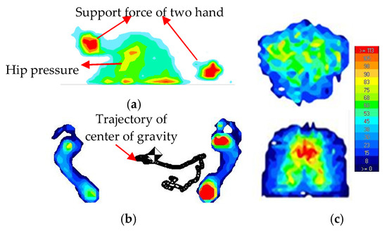 Figure 10. The pressure distribution of each part during the self-rising transfer. (a) Support pressure of rising; (b) plantar pressure and trajectory of center gravity; and (c) trunk pressure. - The continuous transfer directly increases the workload of the user. With the increase of transfer time, great physical consumption and mental stress cause the mental fatigue of a user with a weak motion capability;