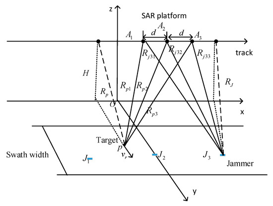 So far, there are many papers dealing with the deceptive jamming techniques against SAR. They primarily concentrate on transponder’s theoretical model, fast implementation algorithm [15,16,17,18,19]. However, these deceptive jamming are usually created by a single transponder. When they are utilized against InSAR or SAR-GMTI, the jamming effect would be reduced, because the created false scene or targets can be eliminated or detected by two or more receiving channels cancellation processing [20,21,22]. In [21,23], the phase difference of the jamming signals generated by a single transponder in the image domain between the master antenna and the slave antenna for InSAR was analyzed, and with the phase compensation, the jamming was easily removed. In [24], the authors concluded that all false stationary and moving targets generated by a single transponder were relocated at the same azimuth position as the transponder, which were easily identified as false targets in SAR-GMTI image. Therefore, the previously mentioned jamming generated by a single transponder plays a limit role in combating the multichannel SAR, which is due to the number of transponders less than the number of SAR receiving channels.