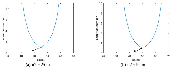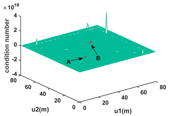 After using Newton’s method optimization processing, it can be found that when gets the minimization and is equal to 1, is only related to and with arbitrary . denotes the azimuth distance between transponders and , while denotes the azimuth distance between transponders and . Figure 2 gives the condition number varying with and when . Figure 3a is the slice graph of Figure 2 in , while Figure 3b is the slice graph of Figure 2 in . According to Figure 3a,b, it can be seen that when , satisfy and , the condition number is equal to 1. Moreover, by searching other values of the condition number in Figure 2, we find only point A and point B satisfy . Considering the false moving targets are easy to diverge from the imaging areas, we choose in the following simulations.