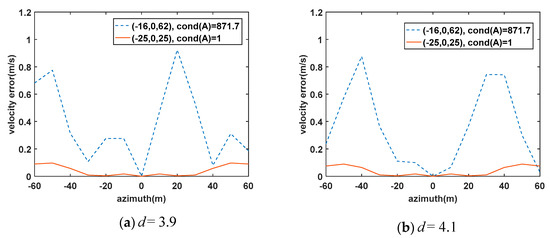 In the optimization calculation, there are only three SAR parameters ‘Carrier frequency’, ‘Center range’ and ‘Baseline length’ in Table 1 are used. They correspond to , and shown by Equation (27), respectively. They all can be estimated by the electronic reconnaissance system. According to these estimated parameters, the complex modulation coefficients modulated in each transponder can be calculated. But in practice, the three parameters would be estimated with errors. If the transponders continue using the layout of the transponder obtained according to the error parameter to generating jamming signals, there is going to be for the receiving antennas, and namely, , . Therefore, the phase difference between and would decide the accuracy of the velocity of the false targets. Correspondingly, the layout of the transponder would affect the accuracy of the velocity. To quantitatively evaluate the influence on the velocity caused by the estimated parameters, we consider two kinds of layout of the transponders. Using the estimated baseline , we can calculate the layout of the transponders under different values of the condition number. We choose and . For , three transponders azimuth position are −25 m, 0 m and 25 m, respectively, corresponding the optimal layout; For , three transponders azimuth positions are −16 m, 0 m, and 62 m. Assume the other two parameters and are estimated accurately. Figure 4a gives the velocity error of the false target for the real baseline of the three-channel SAR-GMTI, while Figure 4b gives that for . The false targets distribute from −60 m to 60 m along the azimuth direction. According to Figure 4a,b, it can be seen the dotted line corresponding to is above the solid line corresponding to whether the length of the baseline is estimated larger or smaller. Therefore, when the SAR parameters are estimated with errors, the jamming performance is more robust for the optimal layout of the transponders. As for the influence on the velocity caused by the estimated parameters and , the results are the same as the according to the characteristics of condition numbers.