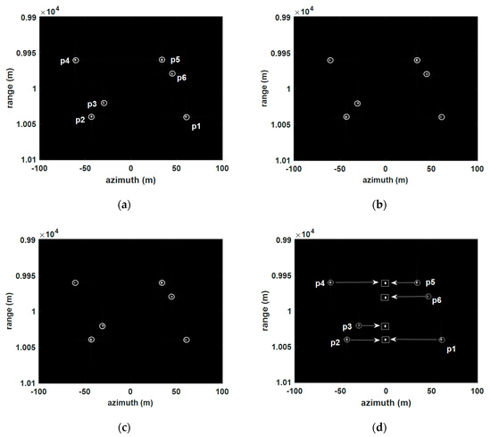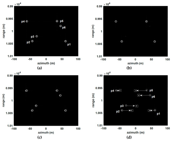Simulations of false targets generated by three transponders. (a) is the SAR image of channel ; (b) is the result of the channel and DPCA operation; (c) is the result of the channel and DPCA operation; (d) is the relocation result.