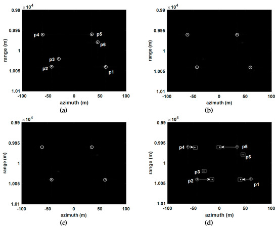 In the second comparative experiment, two synergetic transponders and are utilized to create the deceptive jamming. According to Equation (22), the expected complex modulation coefficients and corresponding to two transponders and for each false target are first accurately calculated and listed in Table 4. Figure 7a shows the SAR image of channel , which all false targets are indicated. Figure 7b is the result of the channel and DPCA operation, while Figure 7c is that of the channel and . Obviously, the false stationary targets are eliminated like clutter in Figure 7b, yet not in Figure 7, which demonstrates the previous analysis accurately that two transponders can only generate very similar targets against dual-channel SAR-GMTI. If the deceptive jamming is used against three-channel SAR-GMTI, the effects would be reduced. Besides, the second six rows in Table 3 shows the estimated velocities and azimuth positions of false targets generated by two synergetic transponders, which have large errors comparing with their setting values. Besides, their azimuth positions are also not relocated the same as any transponder. Figure 7d depicts the relocation of these false targets, which differs from the distribution of false targets shown by Figure 5. Therefore, it can be concluded that deceptive jamming generated by two synergetic transponders has a limited effect against three-channel SAR-GMTI.