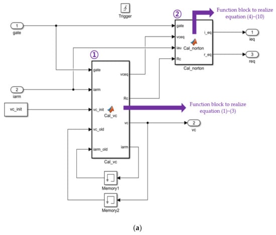 Figure 8 is the internal block of Figure 7b,c. Figure 8a displays the inside of Figure 7b and Figure 8b shows the block where the variable resistance of Figure 7c was implemented. Figure 8a consists of a trigger block and two Matlab function blocks (①, ②). These blocks carry out a calculation once per 10 µs with trigger signals. Matlab function block ① is in charge of the implementation of Equation (1), which is the voltages of individual SM capacitors. Since Equations (2) and (3) are necessary to implement Equation (1), gate signals (gate port), the arm current (iarm port), and the initial value of the SM capacitor (vc_init port) are received as default inputs to carry out calculations at a constant calculation cycle through the trigger block.
