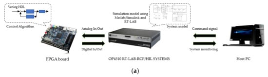 It is difficult to make and implement actual products to verify algorithms in terms of time and economy. Therefore, real-time simulations should be applied using hardware-in-the-loop simulation (HILS). HILS is a real-time simulation system that combines hardware and software and is a technique that can analyze complex models in real time. In recent years, HILS systems have frequently been used when the cost, time, and safety requirements for building a test environment matter, such as in power electronics [,].