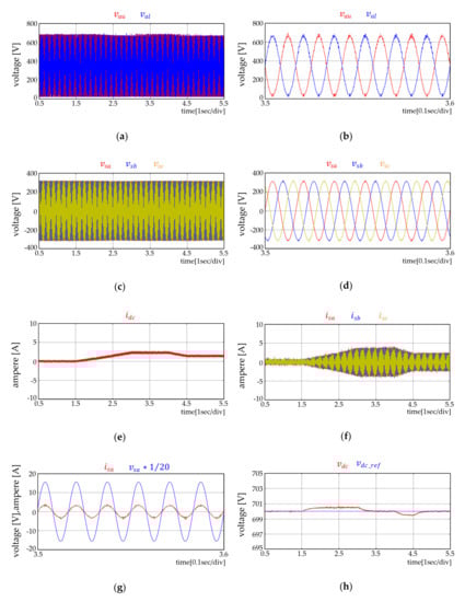Figure 17g depicts the pole voltage and phase current, and it can be seen that the power factor at the grid side is controlled to 1 by confirming that the voltage and current waveforms are in phase. Figure 17h shows the DC stage voltage and the setpoint, and the DC stage voltage has a ripple of 0.5 V, which corresponds to about 0.07% of the setpoint, so it can be seen that the voltage control is well done. Figure 17i,j shows the SM capacitor voltage of the phase A upper arm, balanced at 23.33 V, which is the value of the DC stage value divided by the number of SMs per arm.
