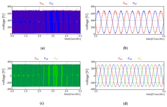 It is intended to show the transfer ability of generated power to grid and control capability of the DC-link voltage with regard to wind speed change. The change of wind speed is as follows: Starting from 0.5 seconds after DC stage voltage stabilizes, the wind speed reaches zero to cut-in speed at 1.5 seconds and the power generation stays at zero watts; then, from 1.5 seconds to 2.5 seconds, the wind speed reaches the rated wind speed, increases the power generation until t = 3.5 seconds, and the wind speed drops to the reduced power generation until t = 4 seconds; then, maintaining a constant wind speed after t = 4 seconds. The arm voltages, as shown in Figure 17a,b, are balanced with 180 degrees inversion each other, and the pole voltages, shown in Figure 17c,d, are also three-phase balanced. Figure 17e illustrates the DC stage current flowing from WSM through the DC stage to GSM (Grid Side MMC), and by compared with the grid-side current, shown in Figure 17f, the change in power generation can be confirmed.
