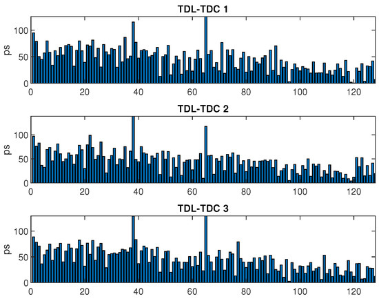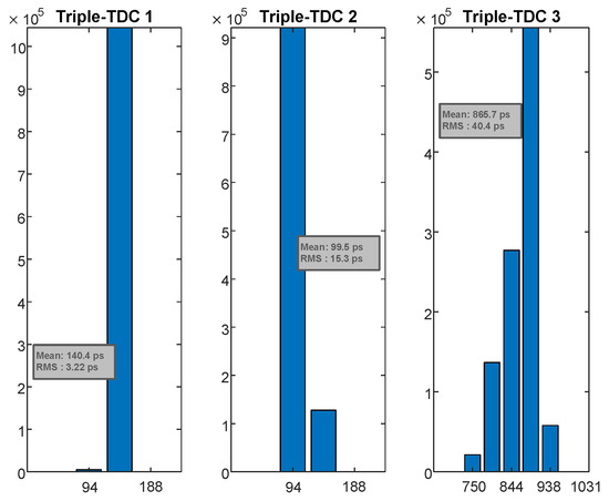 To demonstrate the performance of the proposed FPGA-based triple-TDC, tests were conducted to calculate the time linearity (DNL and INL) and time resolution (RMS). In the multi-mode operation, the proposed triple-TDC can convert three time difference signals. The measurement results indicate that the DNL values of the triple-TDC were , , and LSBs and that the INL values were , , and LSBs. The DNL values of the triple-TDC improved by , , and compared with the DNL values of the traditional TDL-TDC without calibration. Moreover, the INL values improved by , , and after calibration, as displayed in Figure 7 and summarized in Table 2. Note that the results of TDL-TDC without calibration are measured from the same TDLs, as shown in Figure 3. Furthermore, the time resolution of the RMS values was measured using the constant-delay input. The histogram in Figure 8 indicates that the three TDCs had good RMS values, especially the first TDC, which achieved a time resolution of ps RMS.