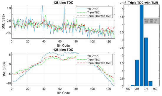 Measured INL, DNL, and RMS values for the proposed triple-TDC with TMR.