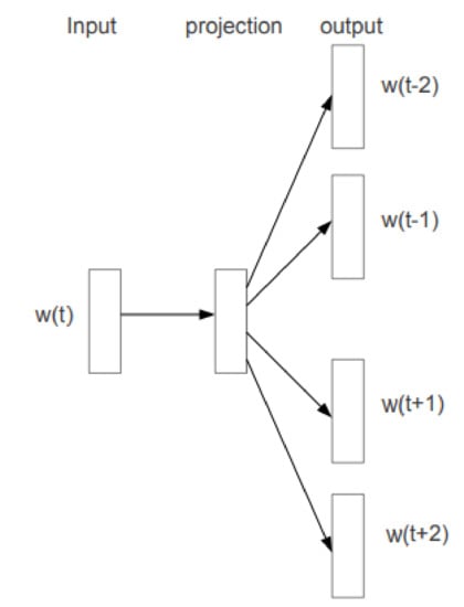 Map sentences consisting of words that are not obviously related to each other to a higher-level matrix and replace semantic relationships between words with mathematical relationships in the matrix. Word2vec has two models: CBOW (continuous bag-of-words) and Skip-gram. This study describes Skip-gram with better performance than CBOW. Suppose a sentence in the corpus is S(Wt−n, Wt−n+l,…Wt,⋯,Wt+n−1,Wt+n), where Wi is a word. The structure of the skip-gram model is shown in Figure 1.