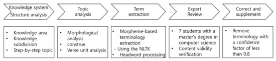 As the terminology dictionary of various fields is presented, there is an open library or ontology related to the developed terminology. However, there is a limit to expressing the structure related to the establishment of curricula considering the specific academic viewpoint and connection with elementary and secondary school. This is because they should be commonly used in various school levels without needing to account for expressions or terms that reflect the characteristics of the curriculum [28]. In order to construct a specialized terminology dictionary for the CS field, it is necessary to consider the terminology that can be included in each school level. The procedure for constructing a terminology dictionary suitable for the above purpose is shown in Figure 2.