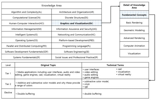 Table 1 reflects a model curriculum for K–12 CS, published in 2003 and 2011 [26,27]. In the case of the CS field, because the curriculum is used not only in higher education but also from elementary to high school, it is necessary to consider a hierarchy in terms of the consistency and continuity of the curriculum.