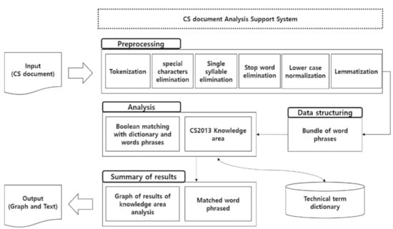 The preprocessing step translates the inputted curriculum documents into a form suitable for the purpose of analysis [28]. This study used the wordnet nltk module for natural language processing. The preprocessing consists of six steps: tokenization, elimination of special characters, removal of one syllable, elimination of idioms, lowercase normalization, and lemmatization. We split the words into tokens and removed the special characters to improve the matching between terms and the precision of the search. We removed letters and abbreviations denoted by one syllable that did not affect the meaning, and converted all the terms in the document to lowercase. Finally, preprocessing was completed through a lemmatization processing, which normalized various types of terms into a basic dictionary form. Lemmatization can improve the accuracy of a search by preserving part-of-speech information [29].