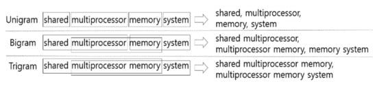 In the data structuring step, N-grams (i.e., unigrams, bigrams, and trigrams) are applied in units of words as shown in Figure 5. After extracting the first n length words from the topic, the process of extracting n lengths by moving to the next word iterates until the end of the main word.