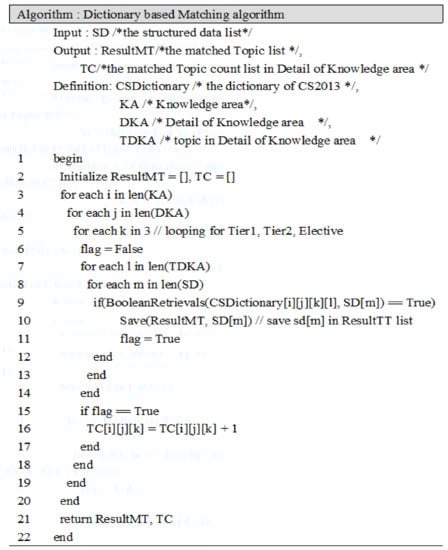 The analysis step is a process of matching the structured data based on the CS2013-based terminology dictionary. In other words, it is a process of analyzing which knowledge domain the terms of the curriculum to analyze are based on the 18 knowledge domains of CS2013. Figure 6 is an algorithm for a specific procedure for matching term extraction.