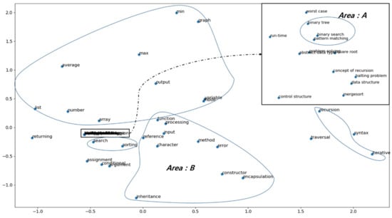 In the case of curriculum, not many terms were utilized, but it can be said that every word was highly significant. The results of Word2Vec were clustered sparsely, but terms could be classified into specific knowledge domains. The clustering results were for PL among the terms of various knowledge areas. For example, in the case of A, binary search, pattern matching, binary tree, control structure, and others constituted a single cluster. In other words, it is interpreted that it could be used as a DKA or element of KA relating to data structures. In the case of B, a cluster is composed of contents closely related to functions such as reference, method, encapsulation, and inheritance, and this fact was referenced in the programming contents structure.