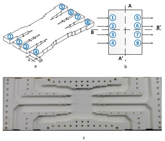(a) Layout of the eight-port coupler. (b) Block diagram of the eight-port coupler with two symmetry axes. (c) Fabricated part by additive manufacturing.