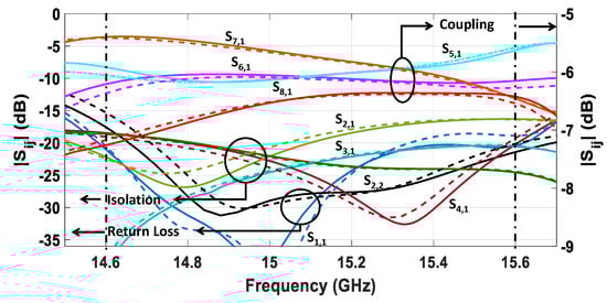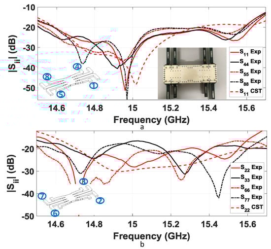 S-parameter measurements were performed using a Keysight E5071C ENA series network analyzer over the frequency range from to GHz. Figure 6a,b show the return loss for Ports 1, 4, 5, and 8 and for Ports 2, 3, 6, and 7, respectively. The obtained return losses for each port were very similar, although the manufacturing tolerances led to a deviation in the measured response, especially in Ports 3 and 7.