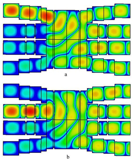 The achieved structure and dimensions are shown in Figure 2. As can be seen, the lengths (), widths (), offsets (), and irises’ thickness (T) for Routing Arms 1 and 2, as well as for the coupling region, were used as the variables in the optimization process. The dimensions in the figure are in millimeters. Figure 3 shows the simulated return losses, couplings, and isolations of the coupler considered in (1) for Port 1 and Port 2 (the value of the S-parameters for equivalent ports in the coupler was the same because of symmetries). The final length of the coupling region after the optimization was 1.9, and its width was 2.7, where was the free space wavelength at 15.1 GHz. The coupler was validated by CST Microwave Studio prior to fabrication with additive manufacturing, showing similar results to MM, as can be seen in Figure 3. Figure 4a,b show the electric field distribution in the directional coupler, when it was fed with the mode through Port 1 and Port 2, respectively. As expected, the electric field distribution of the mode in the central region of the problem can be seen in the figure.