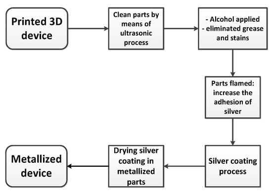 Additive manufacturing [,] using plastic was used for the prototype implementation. Since the 3D printed waveguide components were manufactured from plastic, they must be metalized using either copper [,] or silver []. A 3D printer was used with Polylactic Acid (PLA biopolymer) material. Given the fact that the ports were very close to each other, waveguide bends were added to the ports to perform measurements. All fabricated parts were metalized by silver coating. The layer of the silver coating had a thickness of m. Before metallization, all parts were cleaned using an ultrasonic cleaning process to remove all dust and particles on the surface; then, isopropyl alcohol was applied to eliminate grease and stains. The parts were flamed to increase the surface tension of the substrate and the adhesion of silver coating. Subsequently, an activation solution was sprayed on the surface to accelerate the initiation of the chemical reaction. Next, metallization solutions were sprayed to create a silver coating on the whole surface. Finally, all parts were dried by air pressure to evacuate the water film. Figure 1c shows the main printed part of the coupler prototype, fabricated and metalized by silver coating. In this work, the fabrication of a prototype with a low cost and low printing time was the aim. The procedure used in this work is shown in Figure 5.