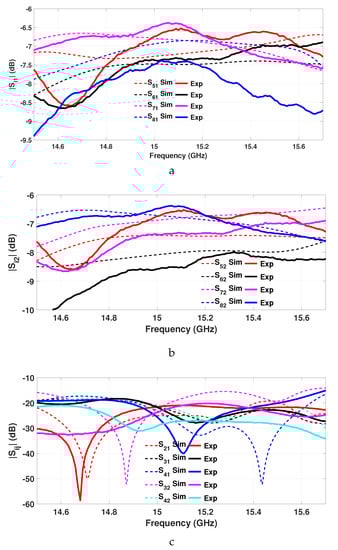 Figure 7a,b show the experimental results for the S-parameters associated with the coupling. The dashed lines show the full-wave simulation response, and the solid lines show the experimental response. The simulation results of the coupler took a bad contact between the lid and the structure into account. This bad contact appeared in the manufactured device when there was no option to put enough screws to tighten the main part with the lid, as happened in the coupling region of the present design. The bad contact was modeled with a separation between the lid and the structure of 0.02 mm.