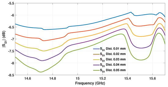 In order to see this effect, Figure 8 shows the simulations (results obtained with CST) of the coupling between Ports 5 and 1 ( parameter), when the gap between the lid and the main body was modified in steps of 0.01 mm. This type of effect was observed in other H-plane structures built with the same approach of a body plus lid [,].