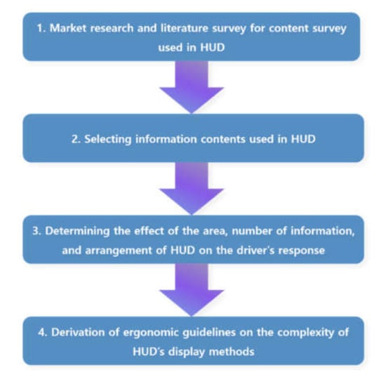 This study investigates the complexity of how automotive HUDs are displayed in the windshield. The study was conducted in four stages, as shown in Figure 1. In detail, it was undertaken sequentially by researching HUD contents through literature and market reviews, conducting the first test of selecting information objects to be displayed, while performing the second test on the number of information, area of the HUD, and arrangement of the HUD, as well as drawing out the display method guidelines for the final selected information.