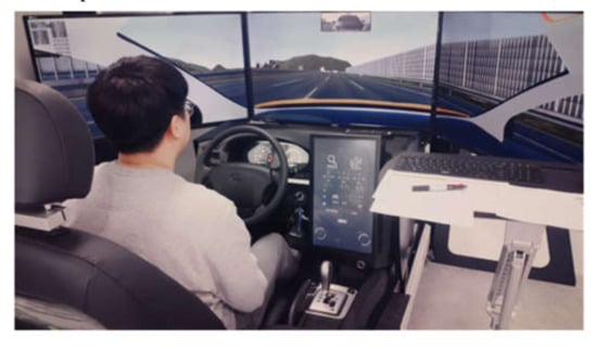 The environment configured for the first test consisted of a driver-centered driving environment through Gridspace’s Driving Simulator Equipment GDS-Driving 300/L Model, as shown in Figure 2. Three 43-inch monitors and a 17-inch touchscreen controller, an automatic shift lever, pedals, and gears were built for the experimental environment.