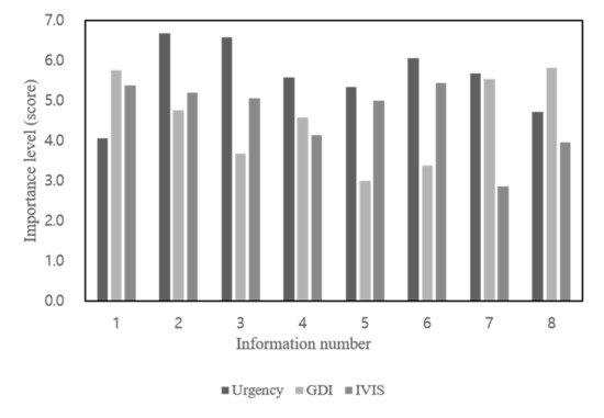 Analysis of variance (ANOVA) was performed to determine whether each factor was meaningful in terms of the importance level. The results showed that statistically significant differences for each factor were found (p < 0.001). Furthermore, the results of the analysis of importance of each classified factor showed that the information in the urgency group related to safety was relatively important, with a closer relationship to safety denoting higher importance as shown in Figure 3. Factors in the GDI group also showed that safety-related information was more important than additional functions such as multimedia or telephone functions. Finally, in the case of information in the IVIS group, safety-related factors were also was found to be relatively important.