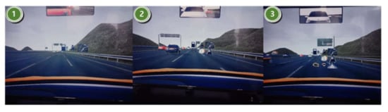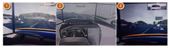 The concept of HUDs was raised for decades, but they were found to be difficult to apply to vehicles other than airplanes [37]. The safety benefits of HUDs are generally small, and, in some instances, HUDs produce poorer performance [38]. After the evolution of self-driving technology, image display through AR has the potential to enhance road safety, induce intuitive driving activities, and improve driving experience. However, the AR technology level, applicable area, luminance, etc. should be more developed. Relevant studies are still being performed through driving simulators rather than in a real road environment [38,39,40]. Based on past research, it is important to consider driver safety and visual distractions in HUD design [37]. Relevant studies on the display area of HUD information also examined the driver’s response to each HUD area and provided design guidelines for the driver’s preferred area. Several prior studies analyzed driver response time and preference changes depending on the display area of the warning image presented on the HUD [41]. Summing up the results of the HUD preference areas presented in the relevant study showed that areas in the left and right directions, with the driver’s seat as the reference center, performed well and were preferable. These results were consistent at a certain level in terms of the results and trends derived from this study. However, unlike several previous studies that identified differences in driver preference depending on the location of the HUD image, the study in Park et al. [24] showed that performance in the lower left or lower right areas was found to be relatively low after considering detailed investigation results specific to the driver’s windshield; thus, this study applied three horizontal areas.