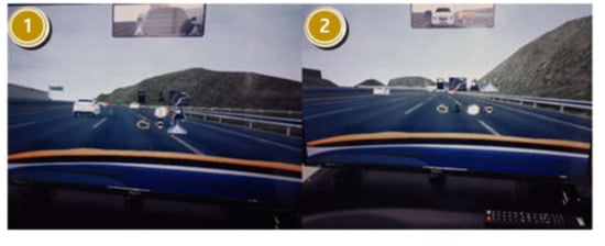 With the development of IVIS, such as in-vehicle entertainment and driving assistance systems, the importance of the HUD, which assists the vehicle-to-driver interface, is increasingly being emphasized. However, in driving situations where visual elements are essential, the information provided during driving should be visually recognizable by the driver up to 90% and the display should be designed to inhibit the distraction of focus in complex systems and to prevent split attention [15,16]. Research was carried out providing systematic information on how to commercialize HUDs, human factors, etc. [17]. A study of the interface between the vehicle and the driver by applying AR, which provides an intuitive and immersive experience, showed that, although the challenge of perception problems should be solved in the HUD, it reduces response time and increases the likelihood of detecting other hazards [18,19,20,21]. HUD-based studies on some elements, such as left-turn and right-turn content, were conducted, but systematic guidelines that include diverse elements and that take safety into account are needed [22,23].