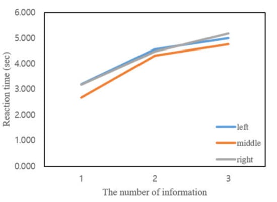 Firstly, the results for the response time according to the level of the number of information and area of HUD are shown in Figure 7. Responses tended to slow down as the amount of information increased. In the case of the area of HUD, one of the design variables, the response was speedy when area 2, and areas 1 and 3 were relatively slow. The response time between the two areas was also shown to be similar. If the number of information is less than three, it is advisable to present the information in area 2. Additionally, if the number of information is less than six, the main information may be placed in area 2, and the remaining sub-information may be placed in area 1 or area 3.