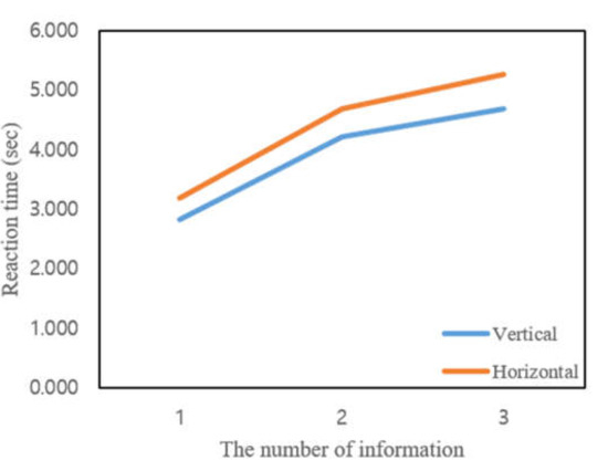 Next, the results for the response time according to the arrangement of HUD and the level of the number of information are shown in Figure 8. As the amount of information increased, driver response tended to slow down. For the arrangement of HUD design variable, it was shown that the responses were slow with arrangement 2 and fast with arrangement 1. With regard to the number of information, fewer than six were found to be appropriate, whereas the arrangement of the HUD should be arranged in arrangement 1 rather than in arrangement 2.