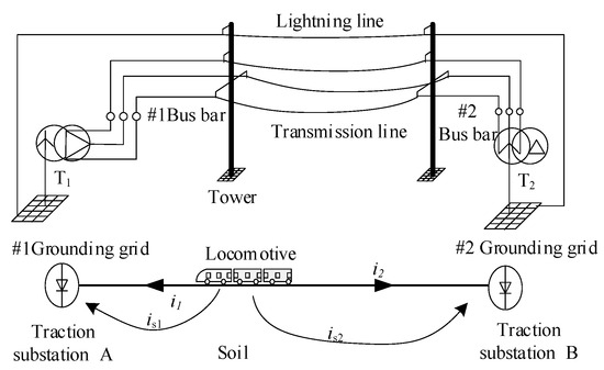 It is indicated how the stray current influences the power grid in this figure. Grounding points, including electric poles or the ground grid of the substations along the subway, form a DC current loop. The direct current flows between transformers, transmission lines and lightning lines. When subway compartment lies between substation A and station B, an un-uniform potential distribution along the line is generated by stray currents is1 and is2. The grounding points at transformer T1 and transformer T2 have a potential difference, which causes a ground loop to form through the AC grid and the earth, causing DC intrusion into the grid.