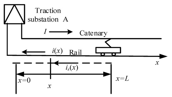 In this paper, a mathematical method for calculating the potential distribution near the subway is proposed. Two methods of power supply to the subway mode are widely used, including single-side feeding and two-side feeding. The impact of subway operation is larger in the case of the single-side power supply mode. A diagram of the single side power supply mode of a subway is presented in Figure 3. As shown in Figure 3, I represents the load current of the locomotive and L represents the distance between the locomotive and substation. The traction station is assumed at point O; the current positive direction is set the same as the direction of the subway compartment; and the current i(x) flowing through rail is a function of x calculated by the formula is(x) = Ii(x).