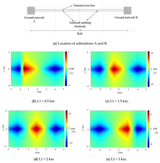 In the simulation in CDEGS, the location of the subway rail and the location of substations including A and B are shown in Figure 9a. Potential distribution on the ground surface is shown in Figure 9b–e. L1 is the distance between the locomotive and the substation A. The value of L1 changes as the subway travels. It is concluded that the farther the locomotive is from the traction station, the higher the surface potential level of the corresponding section is.