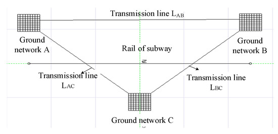 In the interconnected power system, the ground loops interact with each other. A three-substation interconnection model is shown in Figure 10. The C substation is connected on the foundation of the model in Figure 9a, which has the same parameters as the A and B substations. The lengths of transmission line LAC and transmission line LBC are 0.75 km.