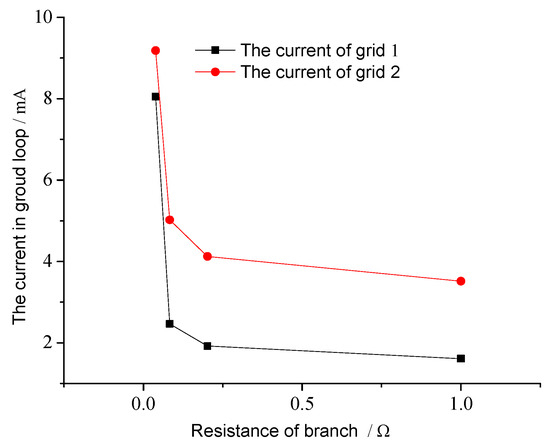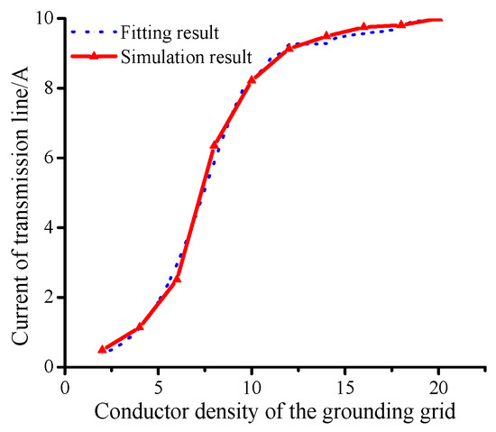 Furthermore, the conductor density of grounding also affects the value of the direct current. Based on the simulation parameters, setting I = 2000 A and ignoring the influence of the ground line, the conductor distribution density of the grounding grid A and the grounding grid B is changed in steps of two. The current in the transmission line changes, as shown in Figure 11.
