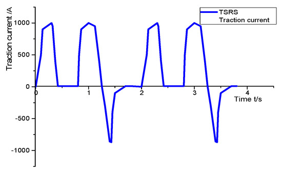 Two state of traction current of locomotive are used widely in the operation of subway, Target Speed Running Strategy (TSRS) and Fastest Speed Running Strategy (FSRS). In this paper, the change in current is used to reflect the various operating conditions of the train. The traction current of TSRS state is shown in Figure 12. Since the current changes rapidly, the transient process in the circuit model cannot be ignored. Combined with the actual parameters of a real case, equivalent transient parameters are shown in the circuit model, as shown in Figure 13.