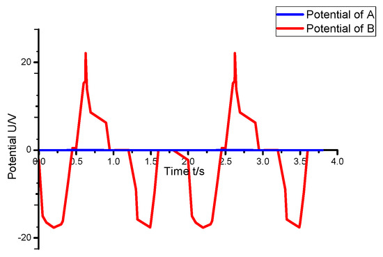 The two points A and B are labeled in Figure 13, which represent the potential change of a fixed point on the rail and the potential change of the substation grounding point. It is obtained from Figure 13 that the change in the traction current affects the change in the stray current in the actual operation of the subway. Although the potential change at B is small, DC current will appear in the AC grid. In the simulation model of this paper, when the maximum traction current of the locomotive is 1000 A, the maximum value of potential at A is 22.76 V, and the maximum value of potential at point B is 1.67 V, resulting in a DC size of 0.387 mA invading the power grid.